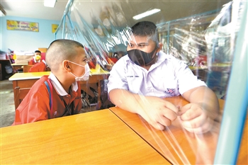 下图:7月1日,泰国曼谷一所小学的学生在教室里隔着防护膜聊天。当日,泰国中小学生开学复课。