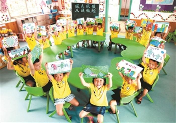 7月2日,湖南省涟源市桥头河镇新培童心幼儿园的小朋友展示手绘的低碳环保作品。