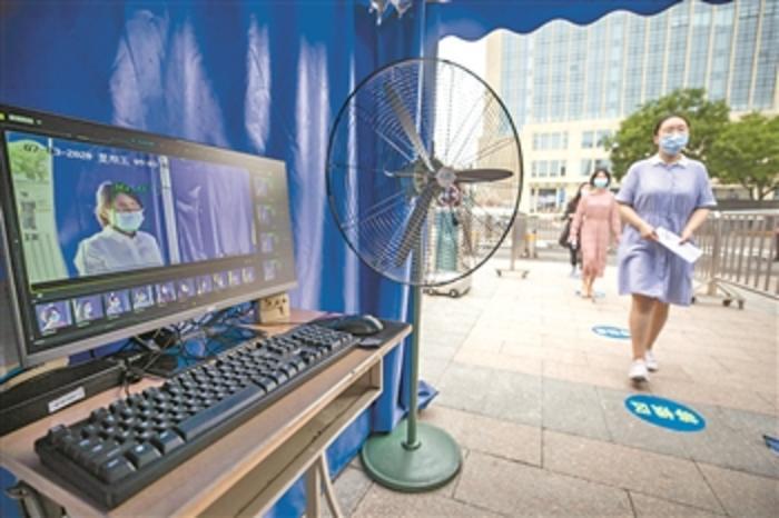 7月3日,北京市第十二中学考点老师在模拟演练考生经过测温设备后进入考点。