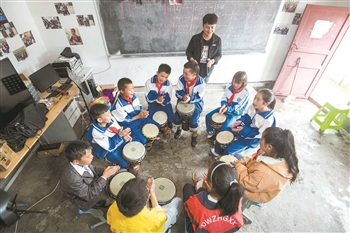 近日,在贵州省六盘水市钟山区大湾镇海嘎小学排练室里,音乐老师顾亚在指导学生手鼓技巧。海嘎小学坐落在海拔2400米的韭菜坪山腰上,常年云雾缭绕,被誉为“云上学校”。2018年,组过乐队的顾亚与学校其他6名老师不谋而合,决定用音符“点燃”在孩子们音乐梦。如今,108名学生在12名乡村教师的带领下学习各类乐器,音乐也成为了大山与外面世界的纽带。尚宇杰 摄/人民图片
