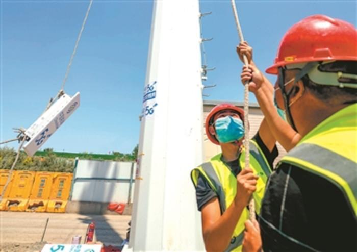 图为在新疆乌鲁木齐奥林匹克体育中心,施工人员在架设5G基站(7月3日摄)。 新华社记者 赵戈 摄