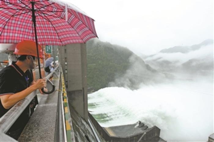 7月7日,新安江电厂工作人员在坝顶查看泄洪情况。