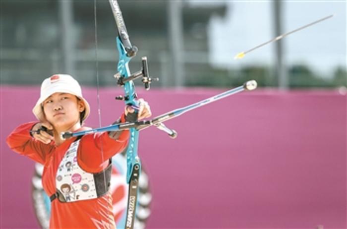 7月6日,在位于南京的江苏省方山体育训练基地举行的射箭项目东京奥运会模拟赛女子反曲弓个人比赛中,中国二队选手安琦轩获得第一名。图为安琦轩在比赛中。