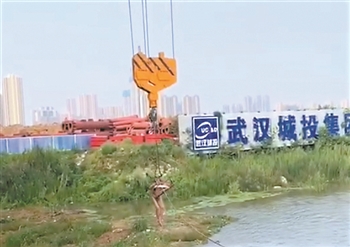 近日,湖北遭遇连番强降雨,汉江水势猛涨。一位年近八旬的老人在汉江游泳时遇险,被困在江汉七桥岸边的杂草丛中。造桥工人发现后,用施工的塔吊放下一个吊篮,救起了老人。