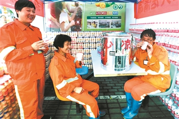 7月9日,浙江舟山金塘镇沥港片区的环卫工人在爱心凉茶铺喝茶休息。当天,由舟山市金塘个体劳动者协会与会员单位大东方超市及金塘城市管理局共同建设的凉茶驿站正式启用,为在炎炎夏日中一线保洁的环卫工人等提供一个可就近休息的场所,并为每位环卫工人送上一份清凉饮品。