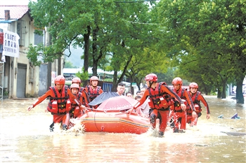 7月9日,在武夷山市崇安街道石雄社区,消防人员转移被洪水围困群众。