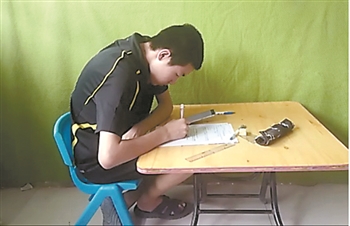宋文创打开手机查看试题内容,开始认真作答起来,努力让自己专注在考试中。手机上的文字密密麻麻,他看得有些费力,大多学生都像他一样用手机查看试题。记者注意到,大家的考试环境略有不同,有的学生专门布置了考场环境,窗明几净;有的学生桌子是临时搬来的,画面有些昏暗;有的学生身后有些泛黑的墙壁上还挂着厨具,插座上还插着电饭煲。