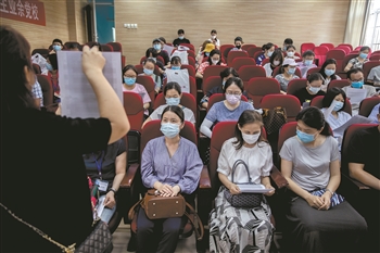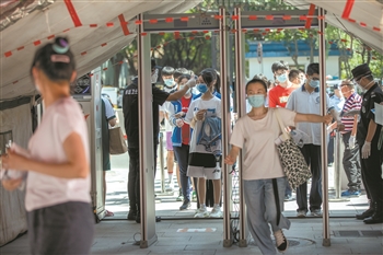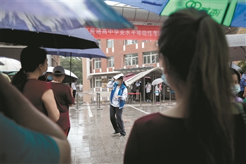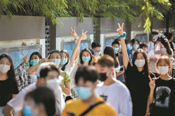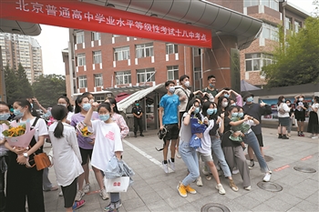 7月7日上午7时,距离高考还有两个小时,地处北京丰台区的北京市第十八中学(以下简称“十八中”)高考考点门前已有考生到达。时值盛夏,清晨刺眼的阳光已经让人睁不开眼,树荫下、墙角边……早到的考生拿出笔记本、教辅书等复习资料抓紧最后的时间“临阵磨枪”,心疼孩子的家长则在一旁摇着辅导机构发放的扇子为他们降温。送考的老师则统一身着红色衣服在考生经过的人行道旁为其加油鼓劲。消毒、测温、查证……8时20分刚过,该考点的400多名考生在考务人员的指挥下,排成四列有序进入考场。在4天的时间里,他们将全程佩戴口罩通过手中的答卷完成这次特殊的“成人礼”。
