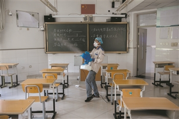 7月6日上午,北京一家公司的消毒员对十八中考点的22个考场和3个备用考场进行了全面消毒。