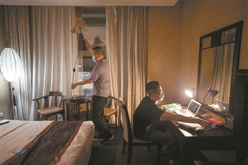 7月6日,高考前一天晚上,在与十八中一墙之隔的一家酒店内,考生赵家毅的父亲拎着大包小包走进房间。与以往在酒店住宿不同,这次行李箱里带的最多的是赵家毅各科的复习资料。一进房间,赵家毅的父亲便忙活了起来。查看窗户隔音、调节空调温度,因为房间内灯光偏暗,他又特意跑到楼下,从车里取出早已备好的护眼台灯。“我想给他尽可能地营造一个良好的学习氛围。” 赵家毅的父亲说,因为家离考点比较远,又赶上雨季,为减少路上来回的奔波,他早早就预定了这家酒店。