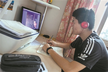 7月3日,居家学习的刘嘉正一个人在卧室复习网课。为了适应高考的节奏,他把各科的复习时间按照高考时的安排制定。