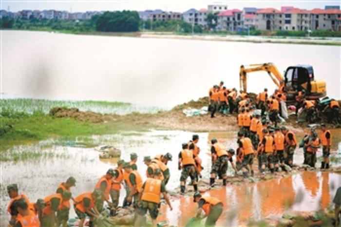 受持续强降雨和上游来水叠加影响,7月12日零时,鄱阳湖水位突破有水文纪录以来的历史极值。武警江西总队500余名官兵坚守鄱阳县昌江圩堤坝一线处置险情。