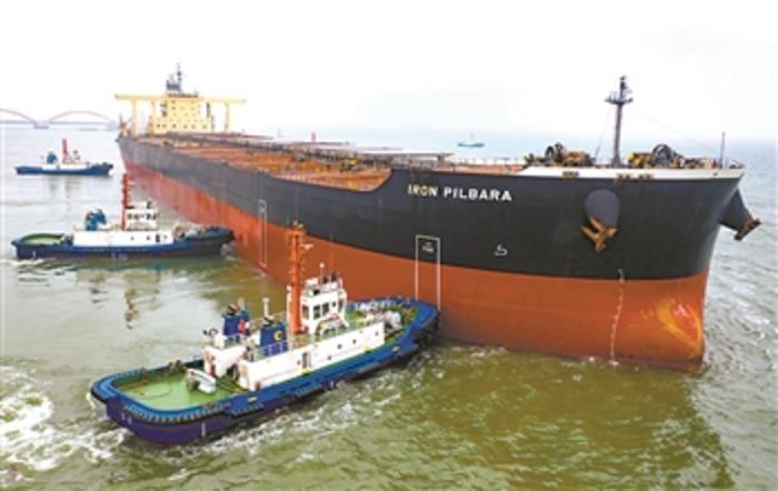 7月12日,一艘轮船在唐山港曹妃甸港区矿石码头卸载后,在拖轮的协助下离港(无人机照片)。今年1至6月份该港口外贸货物吞吐量9112.9万吨,同比增长19.6%。