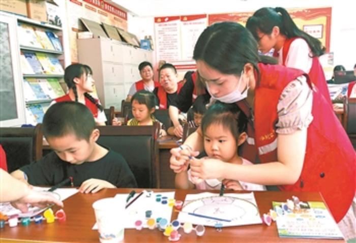 7月11日,安徽省合肥市庐江县阳光公益协会组织志愿者来到庐城镇磙塘社区“儿童之家”,义务指导留守儿童学习手工、舞蹈、绘画,为孩子们送上一份特别的快乐。
