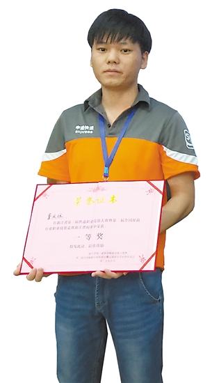 凭借出色的工作完成效率和娴熟的业务技能,李庆恒被“看见”了。“可能是在一线操作时动作比较麻利,所以第一年就被公司派去桐庐参加了快递员技能比赛,而且第一次比赛就获奖了。”他回忆说。
