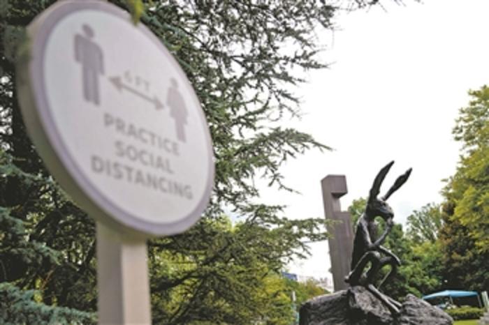 7月11日,在美国华盛顿的国家艺术画廊雕塑公园,一座雕塑旁立着保持社交距离的提示牌。