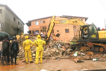 7月11日,一辆挖掘机在尼日利亚拉各斯的楼房坍塌现场参与搜救工作。尼日利亚经济中心拉各斯11日发生一起居民楼坍塌事故,造成至少3人死亡、9人受伤。