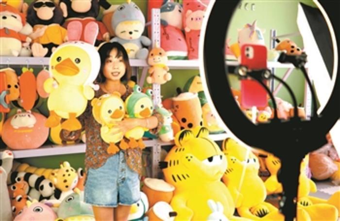 7月13日,河北省内丘县一家玩具生产企业工作人员通过网络直播销售毛绒玩具。