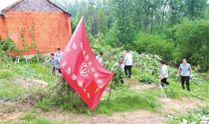 一上午时间,突击队砍除了100多米长堤坝上的杂草杂树。很多人的衣服都被汗湿透了。