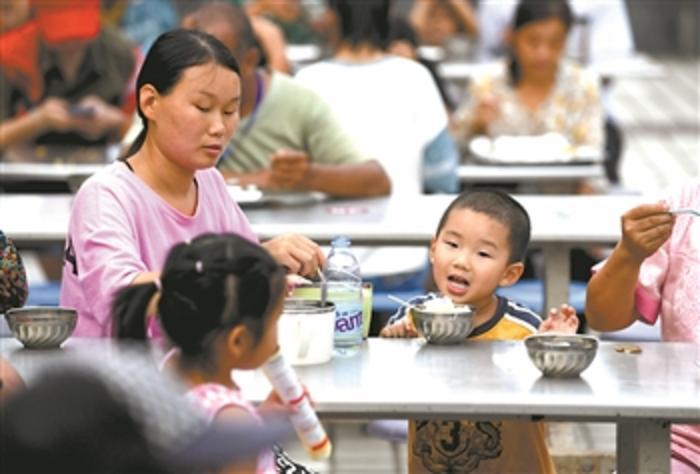 7月14日,小朋友在宿松县洲头乡中心小学集中安置点吃晚餐。近日,安徽省宿松县洲头乡泗洲村的300多名村民因洪水被转移到该乡中心小学集中安置点。安置点工作人员、志愿者利用学校食堂为村民们烹饪饭菜,让村民们在安置点吃上热腾腾的三餐。