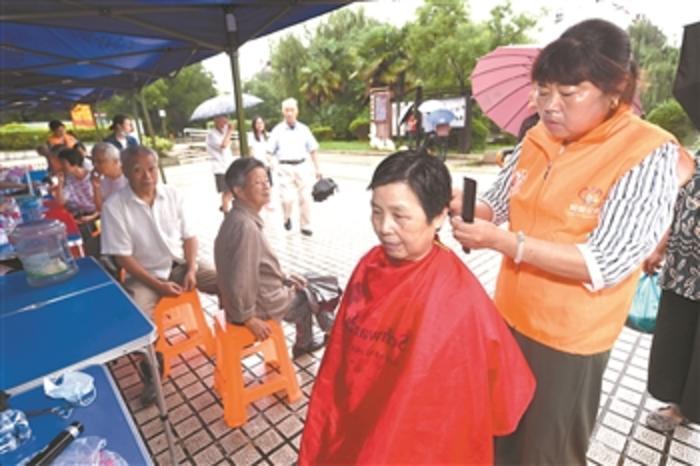 7月15日,七彩志愿服务流动车停在龙泉街道白鱼潭社区的广场上,志愿者为居民提供理发服务。