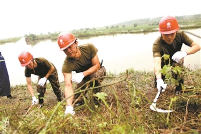 7月14日,在安徽郎溪县毕桥镇团结圩排涝站,一支统一着装,手持镰刀,由郎溪县总工会组织的工人突击队在斜坡排成一排,迅速投入到清障除杂战斗中。为保证潜在险情“早发现、早处理”,该县总工会组织工人突击队参与防汛救灾各项工作。