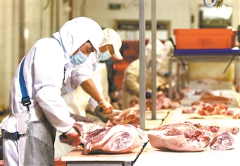 7月15日,北京二商肉类食品集团有限公司员工在肉类分割流水线上工作。