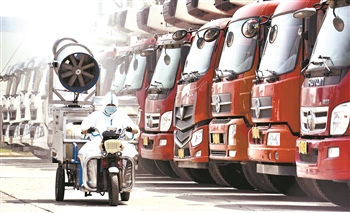 7月14日,北京二商肉类食品集团有限公司员工在对肉类运输车辆停靠区域进行防疫消毒。