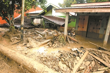 下图:7月14日,在印度尼西亚南苏拉威西省马桑巴拍摄的遭洪水袭击的道路和房屋。印度尼西亚搜救官员14日证实,印尼南苏拉威西省日前发生的洪灾已造成13人死亡、46人失踪。