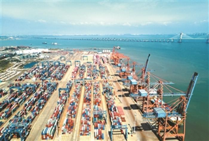 图为7月15日,在福建泉州最主要的现代集装箱港石狮石湖港,大型机械在吊装集装箱。