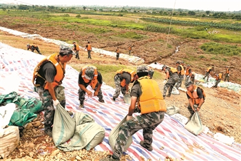 图为7月16日,江西省余干县康山乡康山大堤,陆军某合成旅的官兵全力围堵管涌,加固大坝。