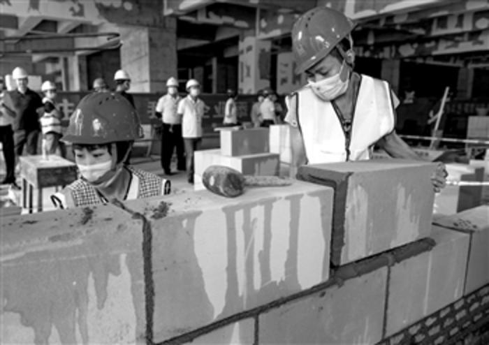 7月15日,湖北秭归建筑工地的工人参加内墙体砌筑作业技能比赛。