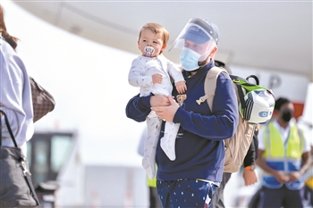 7月15日,一名戴着口罩的旅客抱着孩子走在马尔代夫维拉纳国际机场内。