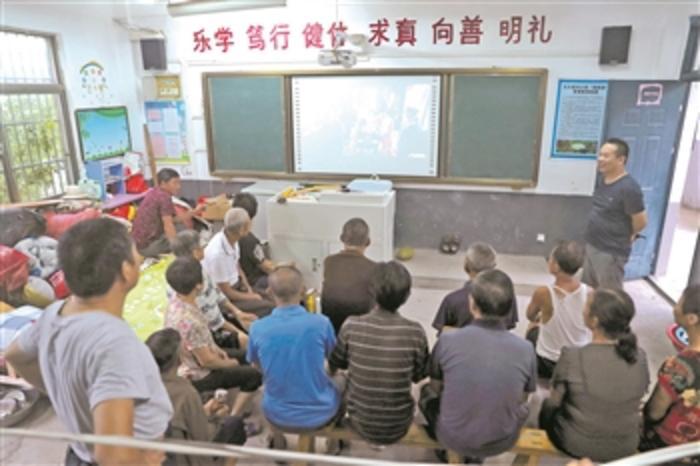 7月17日下午,在安徽芜湖长江大堤边的一处中学安置点内,居民们正在一间教室内通过多媒体设备看电影。