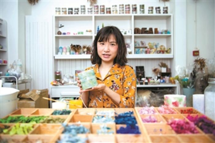 创业者陈敏敏在澳门乐缘文创教育中心店里。“80后”陈敏敏于2017年开办乐缘文创教育中心,主营蜡烛礼品订制及教学。