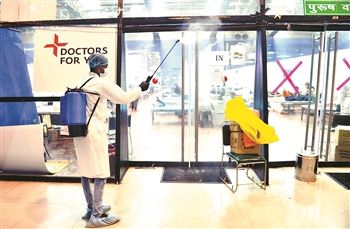 7月19日,一名工作人员在印度新德里一处新冠治疗中心喷洒消毒液。近期印度确诊病例急速增长,专家认为这是各地过早放松管控等因素造成的。