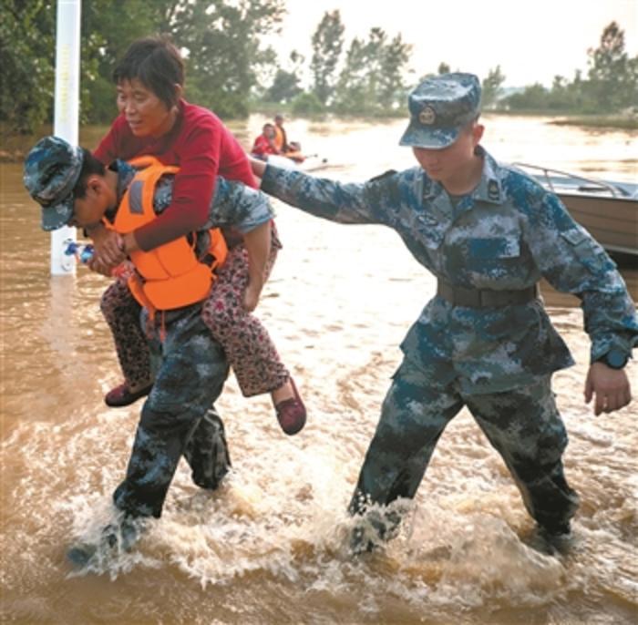 右图:两名战士正将一名行动不便的老人背至安全区域。