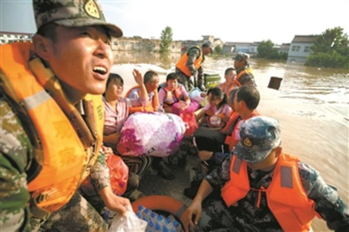 图为7月20日,安徽省六安市固镇镇,受灾群众正在持续转移中。7月19日,受强降雨影响,该地发生严重内涝,1万多群众被困,成为“孤岛”。六安军分区、六安市裕安区人武部组织力量救援。