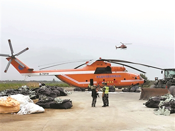 图1为加油员准备加油。图2为全球最大直升机米-26在加油。图3为米-26准备运送石块填补溃口。图4为米-171运载集装箱堵溃口。