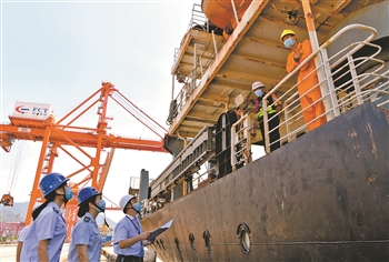 上图:7月21日,在福州青州集装箱码头,国家税务总局福州经济技术开发区税务局工作人员走访停泊码头的集装箱货轮,了解外贸企业的出口状况。