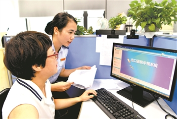 左图:7月21日,在福建新大陆通信科技股份有限公司,国家税务总局福州经济技术开发区税务局工作人员在帮助企业财务人员使用出口退税申报系统。