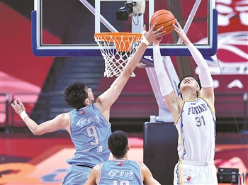 7月20日,福建豹发力队球员王哲林(右)在比赛中上篮。