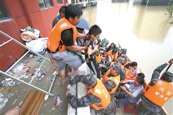 7月19日上午,安徽省六安市固镇镇境内东、西汲河出现历史以来首次全线溢坝,形成百年一遇的严重洪涝灾害。7月21日,在一片白茫茫的洪水包围下,固镇镇就像一片汪洋中的一个“孤岛”,救援队员们乘着橡皮艇,沿着已经变成“河道”的街道到处寻找需要救援的群众。