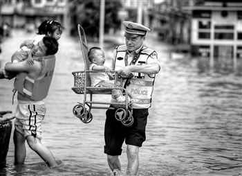 7月20日,安徽巢湖市公安局夏阁交警中队民警在积水中对受困民众进行救援转移。连日来,安徽遭遇强降雨,多地降雨量超历史极值,巢湖市境内多处低洼地带积水严重,巢湖市公安局交管大队组织警力投入防汛抗洪工作中。