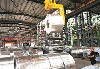 7月23日,工人在唐山市丰南区一家冷轧镀锌钢板企业操作吊装设备将镀锌钢板装车。