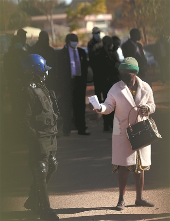 7月22日,在津巴布韦首都哈拉雷,警察检查行人的通行证。