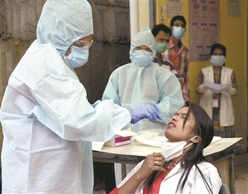 7月21日,医务人员在印度比哈尔邦一处新冠病毒检测点为一名女子采集检测样本。