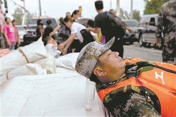 “瓶倒即可醒,醒来接着干!”7月20日,在安徽六安固镇镇抗洪救灾现场,已经连续奋战了近24个小时的杨飞在冲锋舟加油保养的间隙,短暂休息。由于害怕睡得太沉,他拿来了一只矿泉水瓶,一端支撑在橡皮艇上,一端顶住自己的头部,只要身体稍有晃动,瓶子就会倒下“叫醒”他继续战斗。
