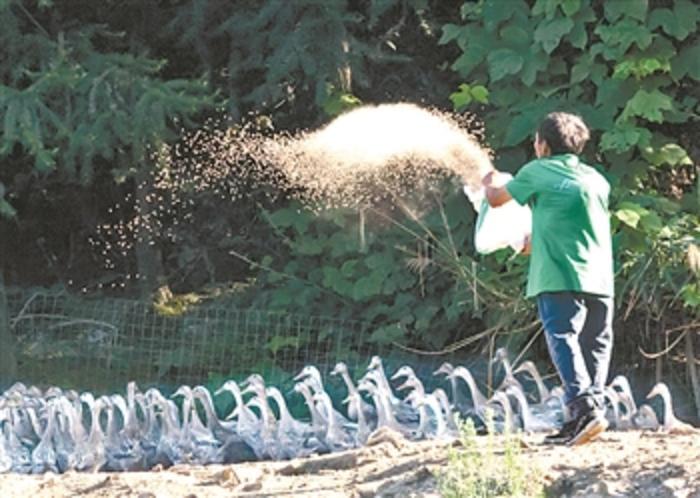 7月22日清晨,江西省新余市欧里镇农民工习细平给鸭子喂饲料。习细平因先天肢体残疾被纳入贫困户,在各级党委、政府和工会组织的帮助下,他开办了养鸭厂,实现了脱贫致富。本报通讯员 刘志勇 摄