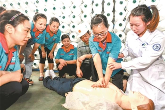 7月28日,浙江省湖州市长兴县吕山乡一家企业内,长兴县中医院医共体集团吕山分院的医务人员正在向车间工人现场教学心肺复苏知识。